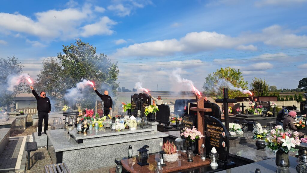 a my? Ktoś przygotowała wiązankę, ktoś inny kupił znicze, jeszcze inny zabrał flagę Bydgoskich Patriotów… Naszym zwyczajem chcieliśmy pożegnać Tomka przy blasku rac… aby nie burzyć zaplanowanego porządku ceremonii pogrzebowej zapytaliśmy rodziny czy będzie to możliwe…. była zgoda a więc były race dla Tomka.